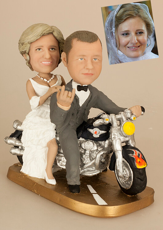 В статуэтке будут собраны воедино все внешние качества человека, а также с любимыми его вещицами, атрибутами. Уникальность в том, что наша студия не изготовляет строго по шаблону свои работы, наоборот же, в Ваших силах изменить и добавить все, что Вам вздумается. Яркая эпатажная статуэтка в виде Ваших радостных друзей — молодоженов на шикарном мотоцикле Харлей-Девидсон поразит всех без исключения!